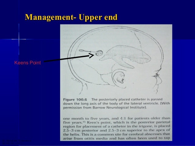 Keen s point is one of the ventriculostomy sites used in neurosurgery typically in pediatrics for ventriculoperitoneal shunt placement. The catheter is placed through the skull and into one of the ventricles spaces of the brain where the cerebrospinal fluid csf collects. The procedure is done for both diagnostic and therapeutic purposes.