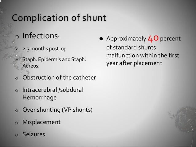 It s estimated up to 4 in 10 shunts will malfunction in the first year after surgery. Sometimes a scan after the operation shows the shunt is not in the best position and further surgery is needed to reposition it. The external portion of the catheter is connected to a valve that regulates the flow of csf based on a preset pressure.